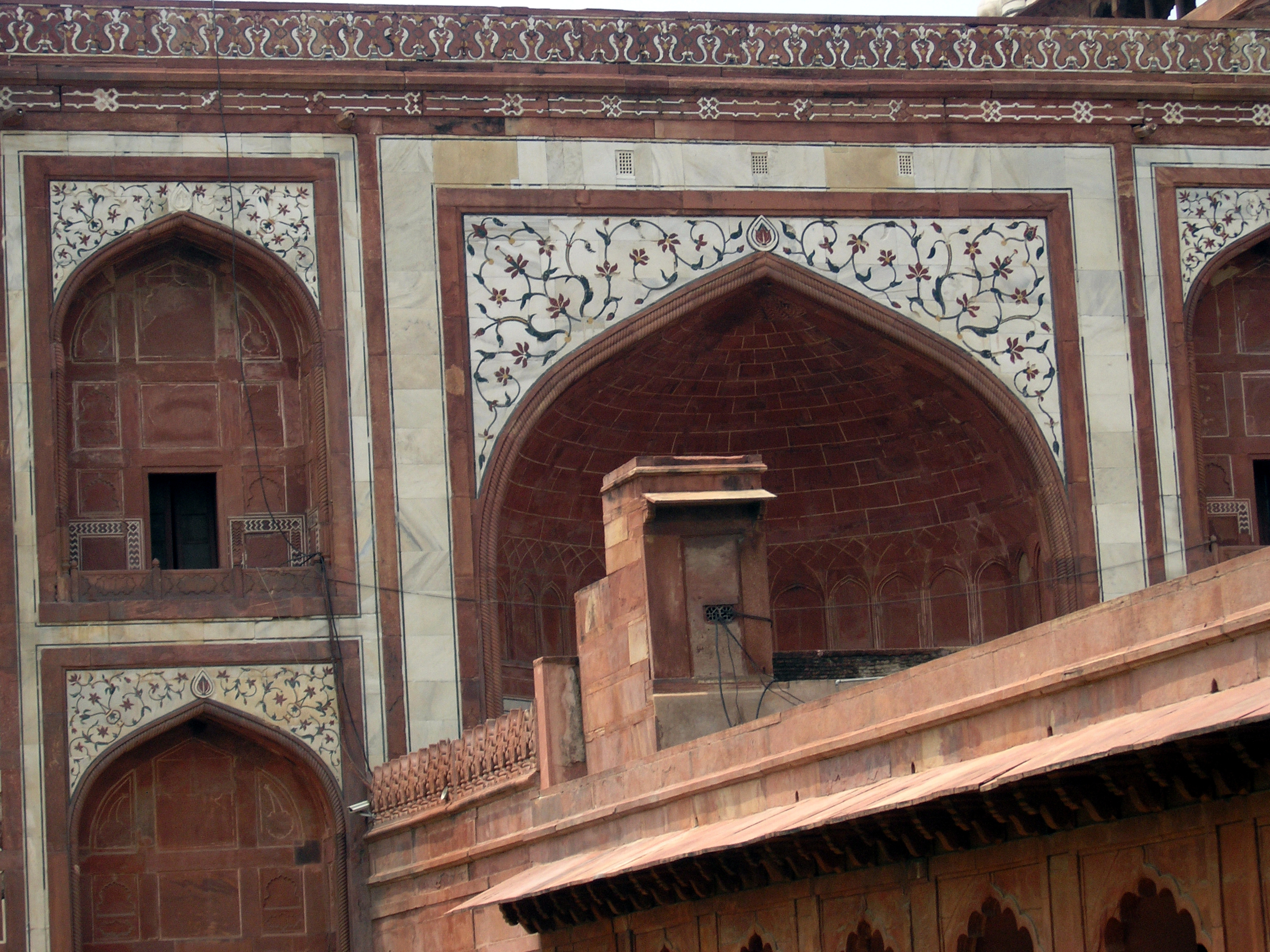 The white marble of the Taj Mahal and the red standstone of the Agra Fort